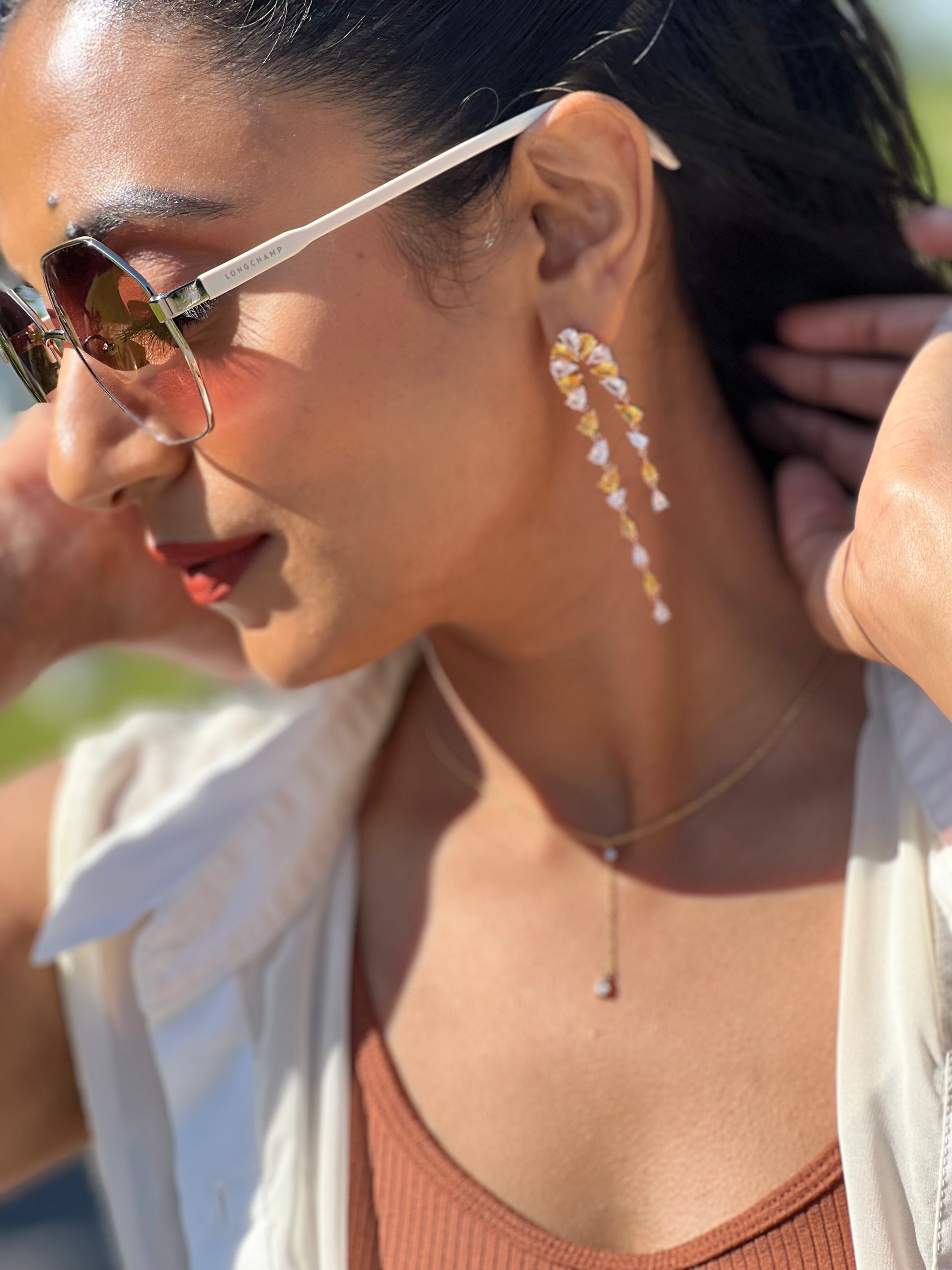 The Arun Yellow Earrings reflect the sun’s warmth and light with their radiant yellow stones, symbolizing vitality, optimism, and new beginnings.